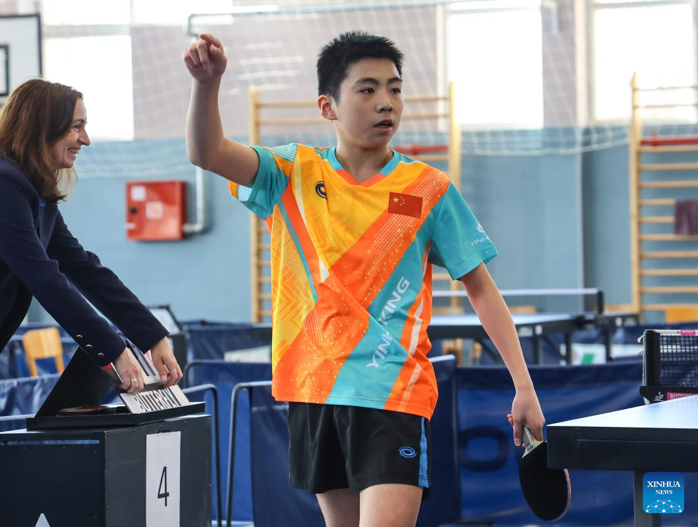 Zheng Quanyu of China gestures after defeating Cheng Min-Hsiu of Chinese Taipei during their table tennis Boys' individual final match at the ISF (International School Sport Federation) U15 Gymnasiade in Zlatibor, Serbia, April 12, 2025. (Photo by Predrag Milosavljevic/Xinhua)