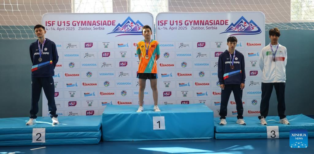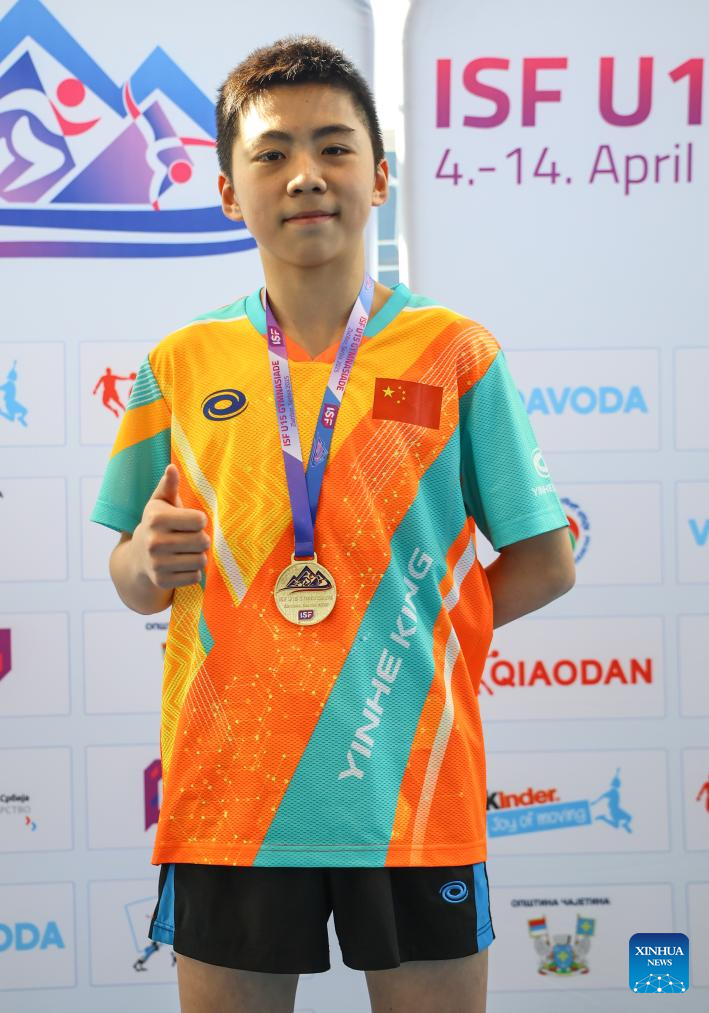 Gold medalist Zheng Quanyu of China poses during the awarding ceremony for table tennis Boys' individual final at the ISF (International School Sport Federation) U15 Gymnasiade in Zlatibor, Serbia, April 12, 2025. (Photo by Predrag Milosavljevic/Xinhua)