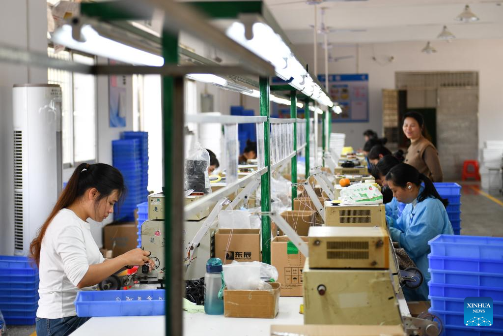 People work at an electronics factory in a resettlement site in Bamianshan Yao Village, Zixing City, central China's Hunan Province, April 10, 2025. (Xinhua/Chen Zhenhai)