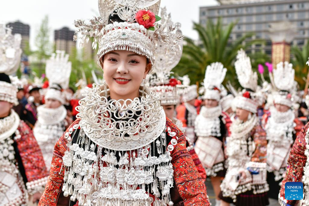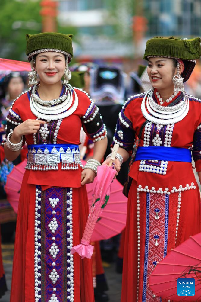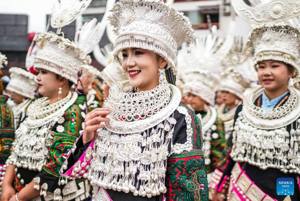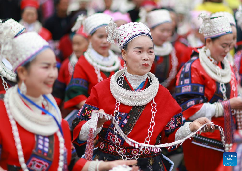 People in ethnic costumes attend an activity to celebrate the Miao Sisters Festival in Taijiang County, southwest China's Guizhou Province, April 12, 2025. Recognized as a national intangible cultural heritage, the Miao Sisters Festival was celebrated here on Saturday. (Xinhua/Liu Xu)