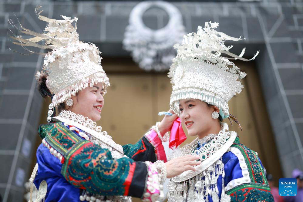 A woman in ethnic costume helps her fellow performer adjust head decorations during an activity to celebrate the Miao Sisters Festival in Taijiang County, southwest China's Guizhou Province, April 12, 2025. Recognized as a national intangible cultural heritage, the Miao Sisters Festival was celebrated here on Saturday. (Xinhua/Liu Xu)