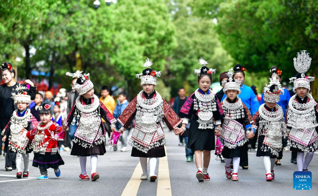Children in ethnic costumes attend an activity to celebrate the Miao Sisters Festival in Taijiang County, southwest China's Guizhou Province, April 12, 2025. Recognized as a national intangible cultural heritage, the Miao Sisters Festival was celebrated here on Saturday. (Xinhua/Liu Xu)