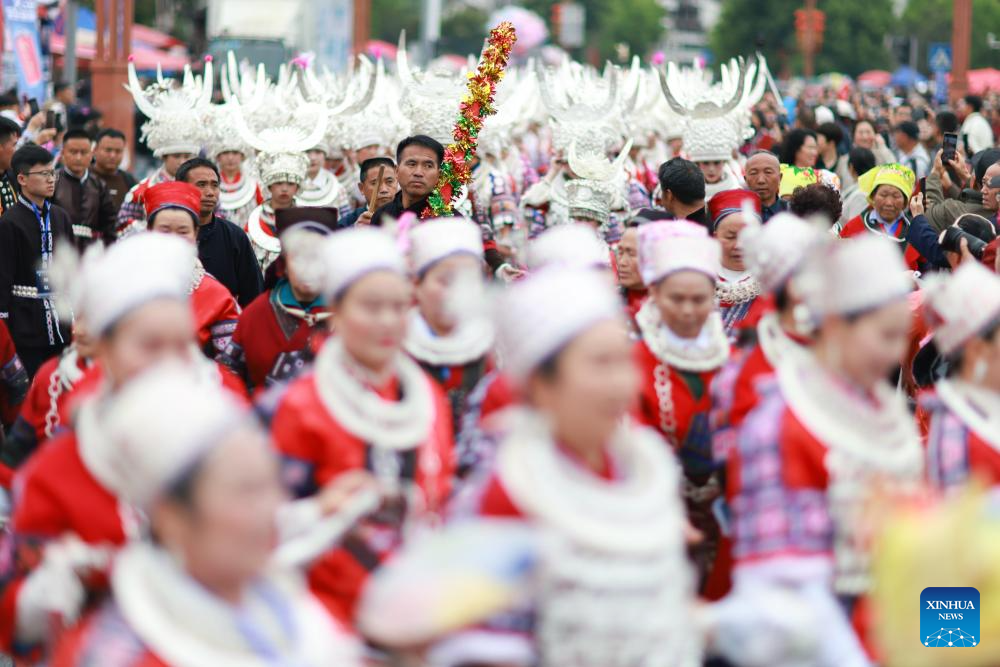 People in ethnic costumes attend an activity to celebrate the Miao Sisters Festival in Taijiang County, southwest China's Guizhou Province, April 12, 2025. Recognized as a national intangible cultural heritage, the Miao Sisters Festival was celebrated here on Saturday. (Xinhua/Yang Wenbin)