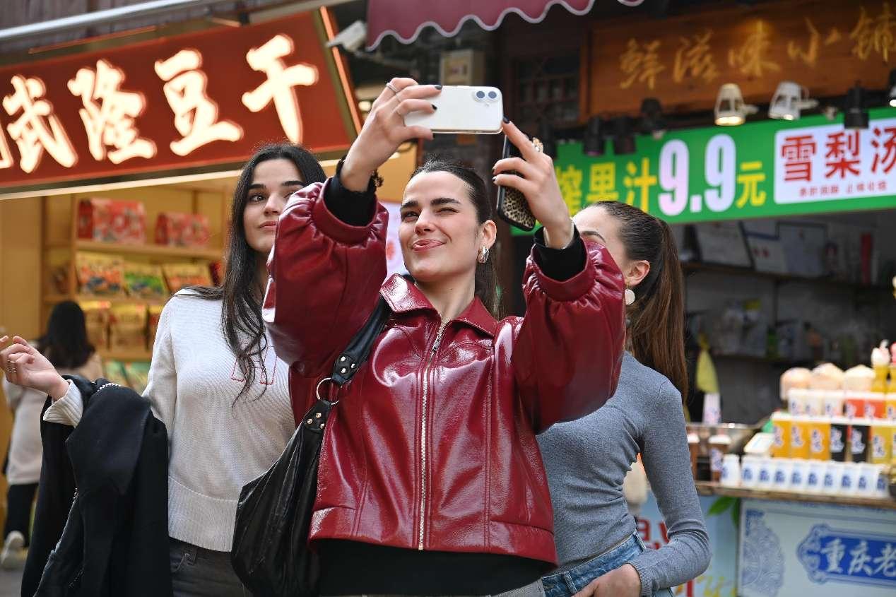 Foreign tourists pose for a picture in Ciqikou Ancient Town, a tourist attraction in southwest China's Chongqing municipality, March 19, 2025. (People's Daily Online/Sun Kaifang)