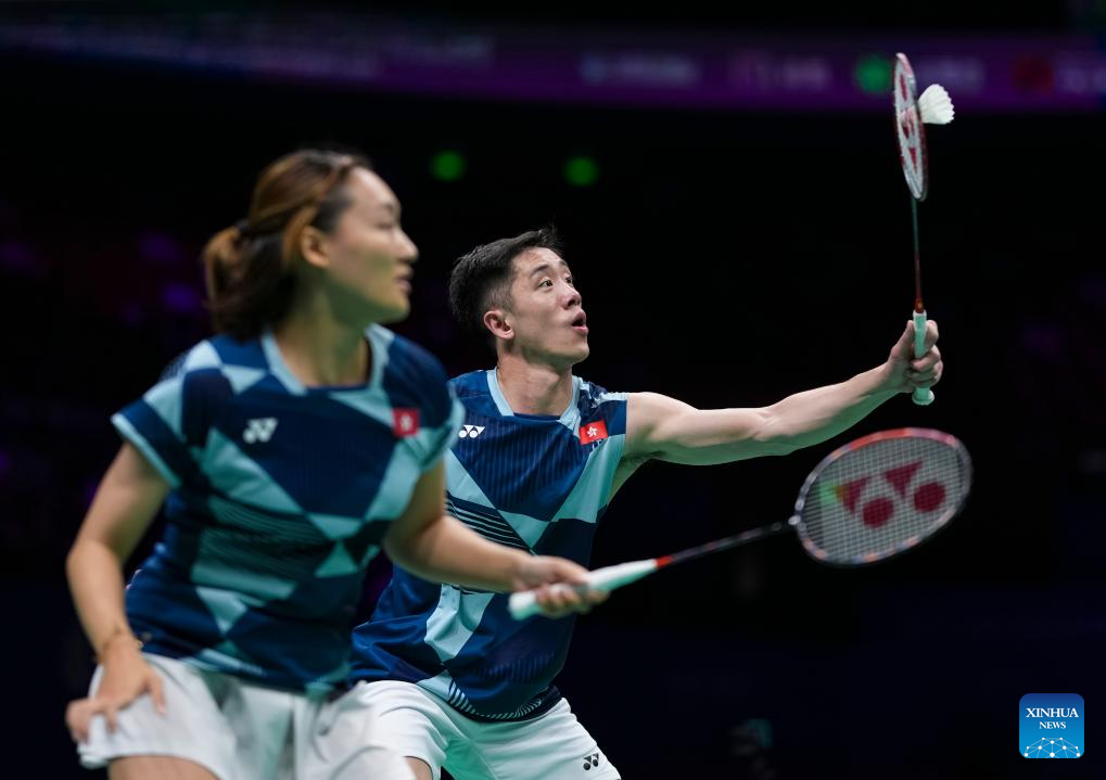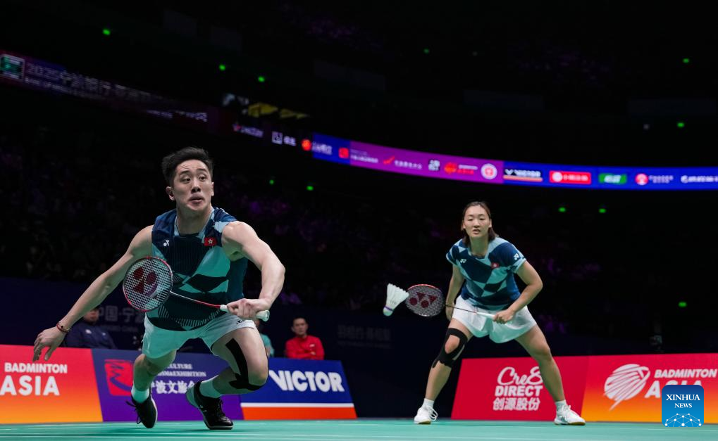 Tang Chun Man (R)/Tse Ying Suet of China's Hong Kong compete during the mixed doubles final match against Midorikawa Hiroki/Saito Natsu of Japan at Badminton Asia Championships 2025 in Ningbo, east China's Zhejiang Province, April 13, 2025. (Xinhua/Sun Fei)