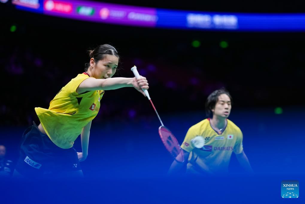 Midorikawa Hiroki (R)/Saito Natsu of Japan compete during the mixed doubles final match against Tang Chun Man/Tse Ying Suet of China's Hong Kong at Badminton Asia Championships 2025 in Ningbo, east China's Zhejiang Province, April 13, 2025. (Xinhua/Sun Fei)