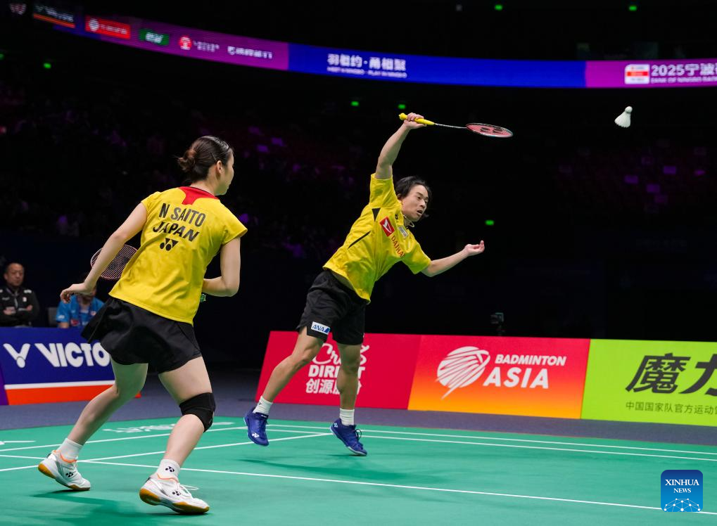 Midorikawa Hiroki/Saito Natsu (L) of Japan compete during the mixed doubles final match against Tang Chun Man/Tse Ying Suet of China's Hong Kong at Badminton Asia Championships 2025 in Ningbo, east China's Zhejiang Province, April 13, 2025. (Xinhua/Sun Fei)