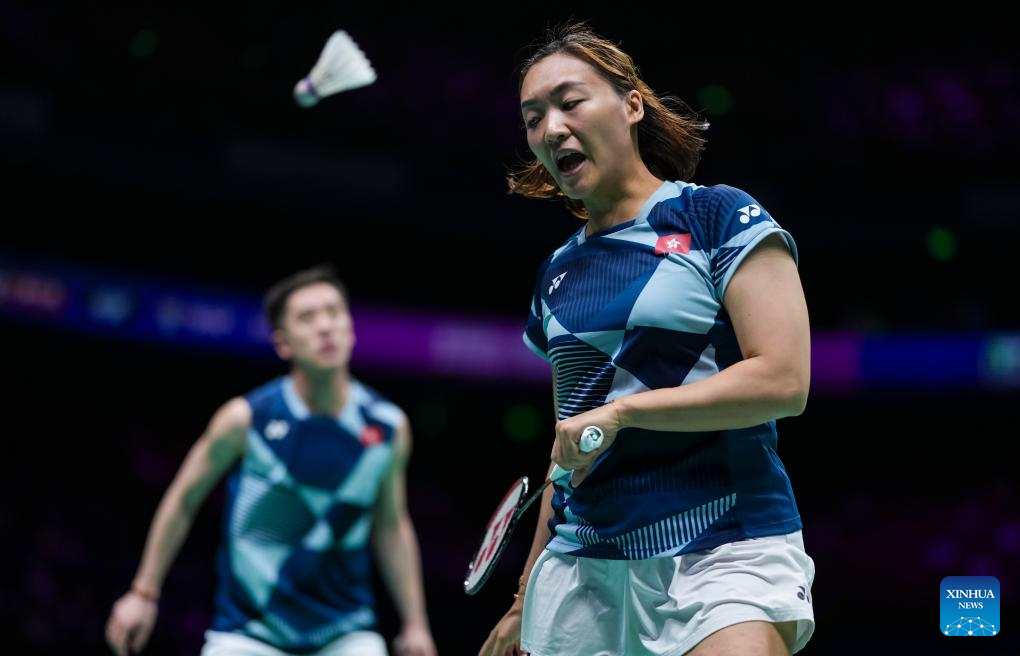 Tang Chun Man (L)/Tse Ying Suet of China's Hong Kong compete during the mixed doubles final match against Midorikawa Hiroki/Saito Natsu of Japan at Badminton Asia Championships 2025 in Ningbo, east China's Zhejiang Province, April 13, 2025. (Xinhua/Sun Fei)