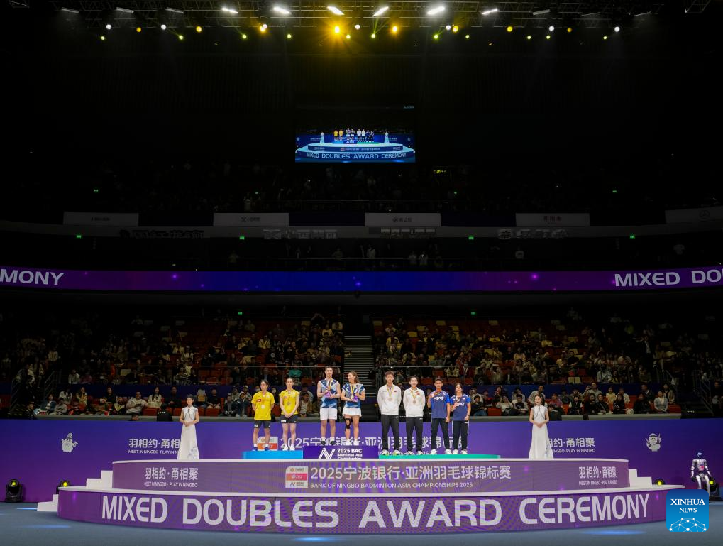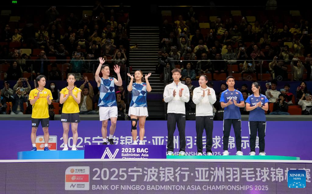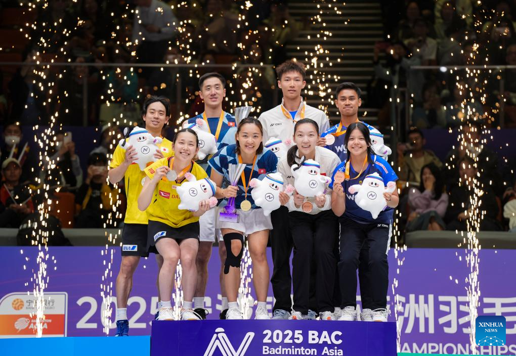 Gold medalists Tang Chun Man (3rd L)/Tse Ying Suet (4th L) of China's Hong Kong, silver medalists Midorikawa Hiroki (1st L)/Saito Natsu (2nd L) of Japan, bronze medalists Jiang Zhenbang (4th R)/Wei Yaxin (3rd R) of China and Jafar Hidayatullah (2nd R)/Felisha Alberta Nathaniel Pasaribu of Indonesia pose during the awarding ceremony for the mixed doubles event at Badminton Asia Championships 2025 in Ningbo, east China's Zhejiang Province, April 13, 2025. (Xinhua/Sun Fei)