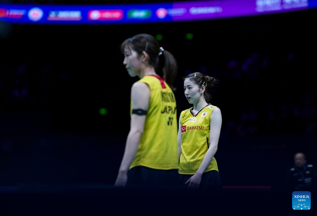Matsuyama Nami/Shida Chiharu (R) of Japan react during the women's doubles final against Liu Shengshu/Tan Ning of China at Badminton Asia Championships 2025 in Ningbo, east China's Zhejiang Province, April 13, 2025. (Xinhua/Sun Fei)