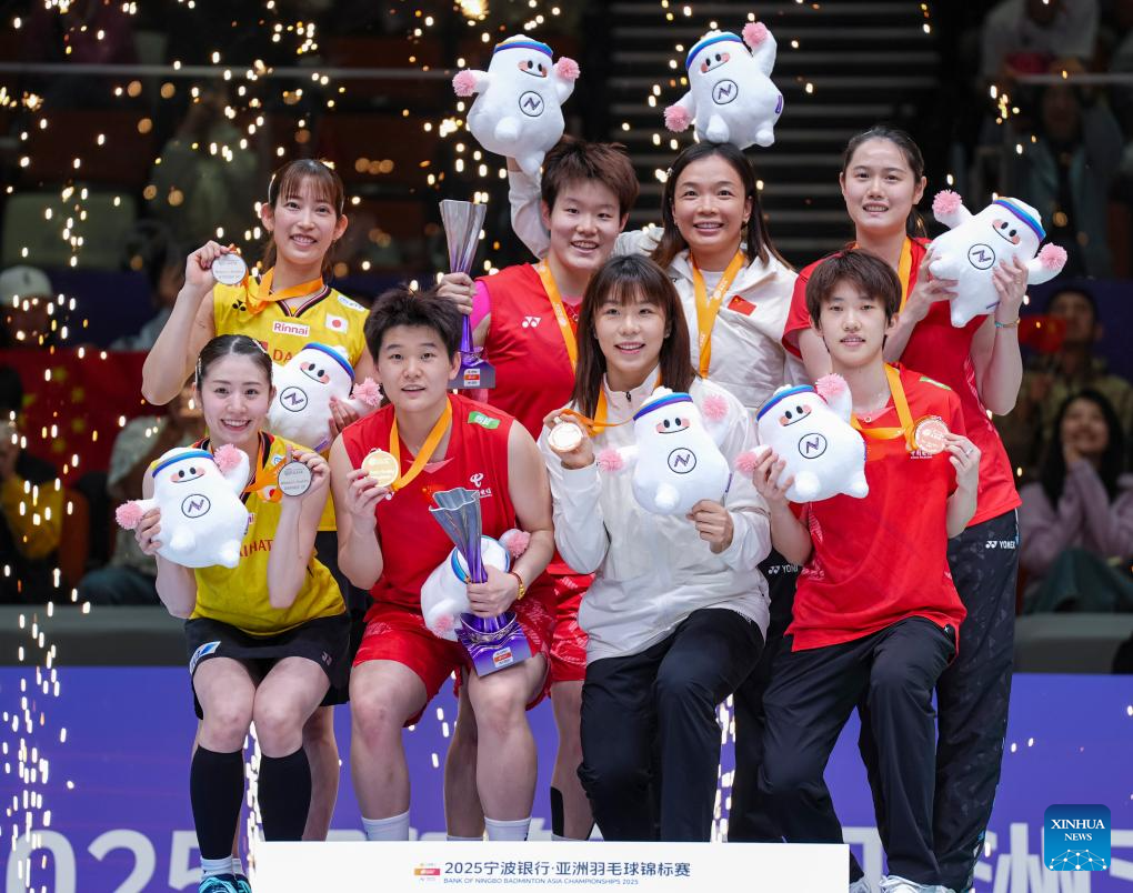 Medalists celebrate during the awarding ceremony for the women's doubles event at Badminton Asia Championships 2025 in Ningbo, east China's Zhejiang Province, April 13, 2025. (Xinhua/Sun Fei)