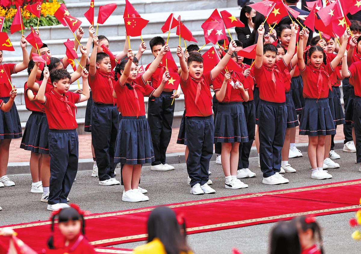 Children wave Chinese and Vietnamese flags, as well as flags of the Communist Party of China and the Communist Party of Vietnam, at the welcoming ceremony for President Xi Jinping in Hanoi on Monday. (Feng Yongbin/China Daily)