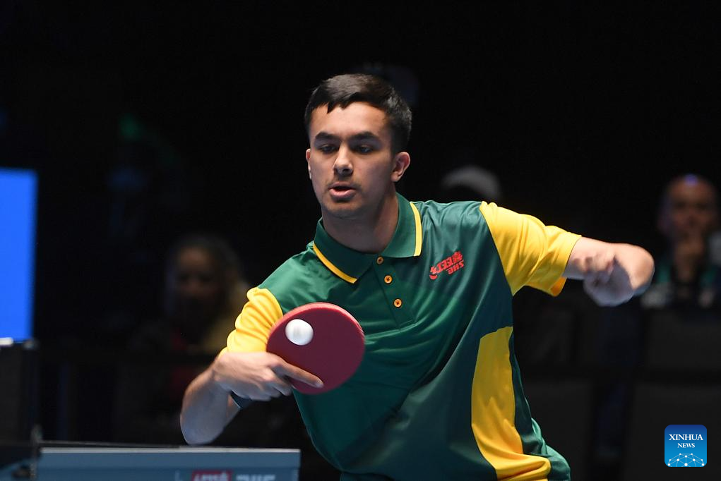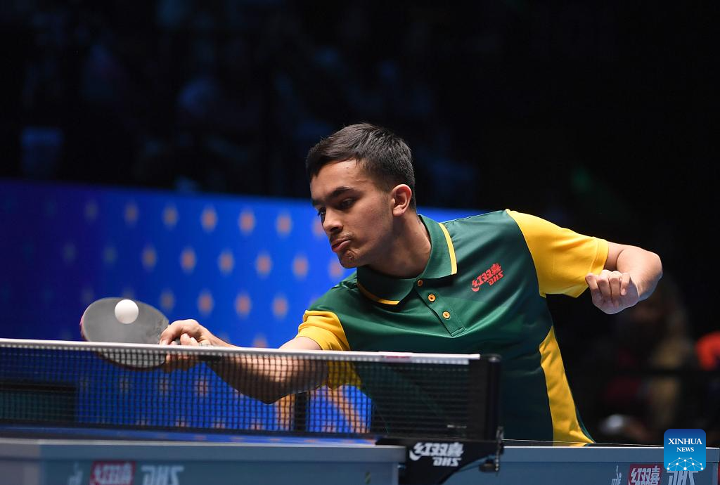 Aditya Sareen of Australia hits a return during the men's singles group match between Wang Chuqin of China and Aditya Sareen of Australia at the ITTF Men's and Women's World Cup 2025 in Macao, China, April 15, 2025. (Xinhua/Chen Duo)