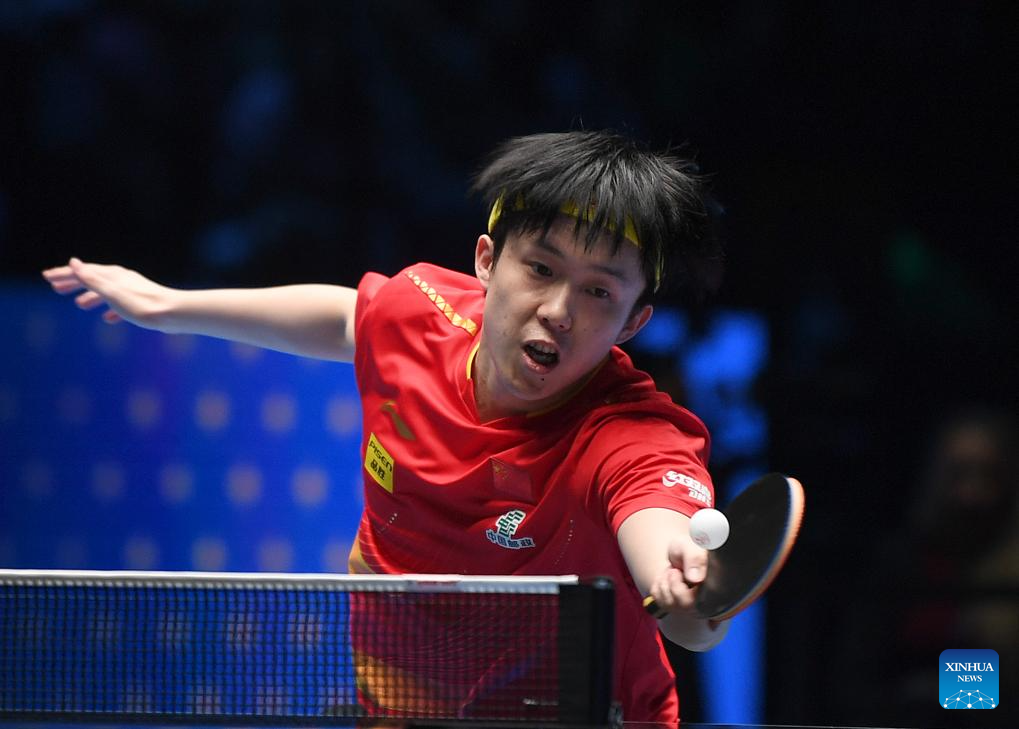Wang Chuqin of China hits a return during the men's singles group match between Wang Chuqin of China and Aditya Sareen of Australia at the ITTF Men's and Women's World Cup 2025 in Macao, China, April 15, 2025. (Xinhua/Chen Duo)