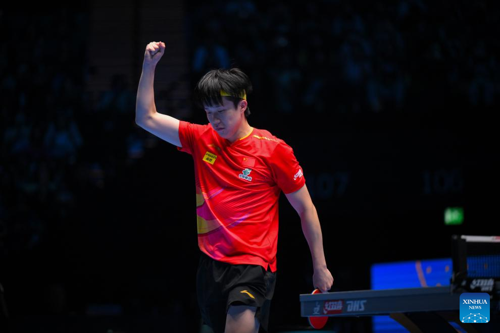 Wang Chuqin of China reacts during the men's singles group match between Wang Chuqin of China and Aditya Sareen of Australia at the ITTF Men's and Women's World Cup 2025 in Macao, China, April 15, 2025. (Photo by Cheong Kam Ka/Xinhua)