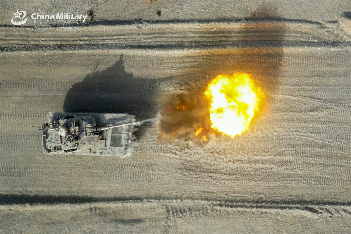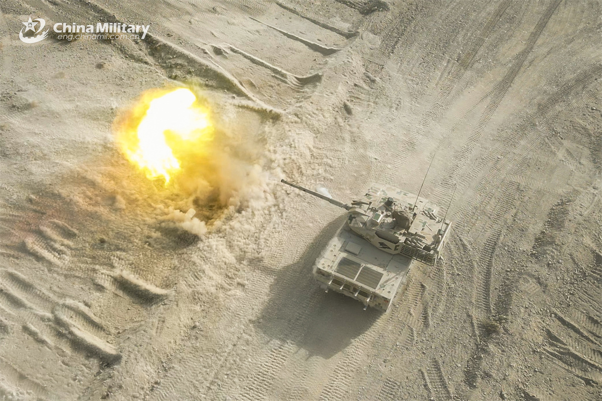 A tank attached to a regiment of the Chinese PLA Army fires at the mock target during a live-fire shooting training exercise on March 31, 2025. (eng.chinamil.com.cn/Zhao Zhiguo)
