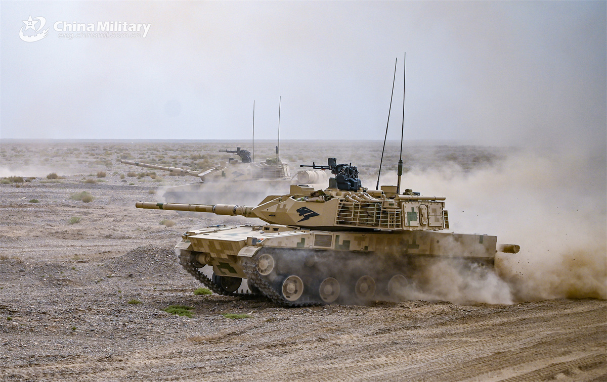 Tanks attached to a regiment of the Chinese PLA Army kick up plumes of dust en route to the designated training field during a live-fire shooting training exercise on March 31, 2025. (eng.chinamil.com.cn/Zhao Zhiguo)