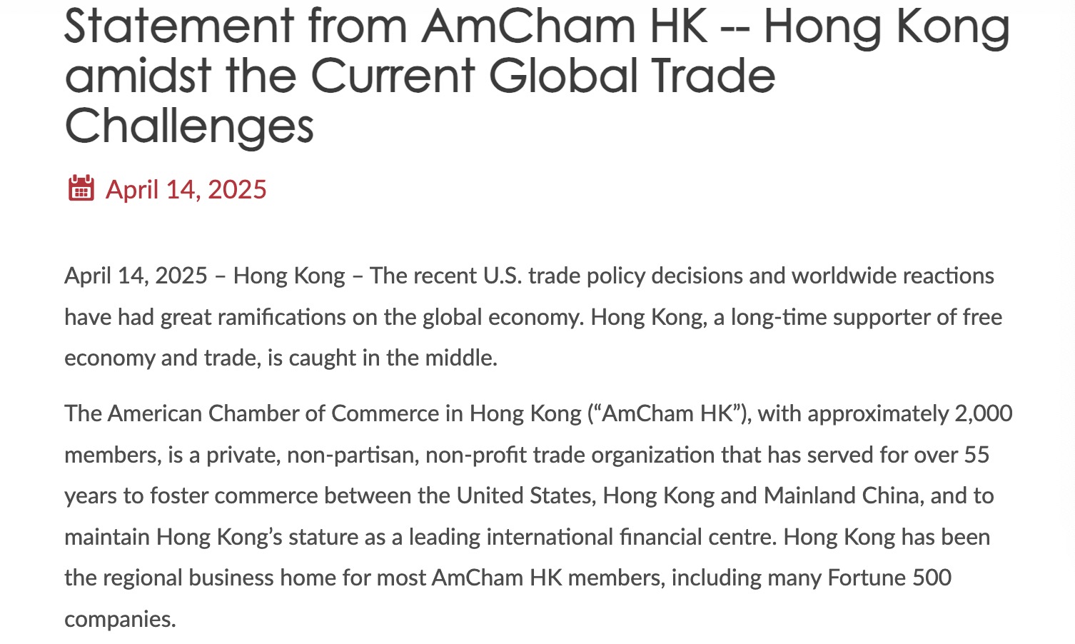 The American Chamber of Commerce in Hong Kong (AmCham HK) issued a statement on Monday firmly opposing the latest unilateral tariff increases by the United States, warning of their negative impact on businesses and urging a more measured approach.