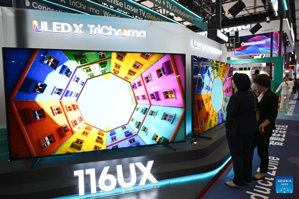 Visitors view a large-size TV at the exhibition zone of smart life products during the 137th edition of the China Import and Export Fair in Guangzhou, south China's Guangdong Province, April 16, 2025. The 137th edition of the China Import and Export Fair, also known as the Canton Fair, kicked off on Tuesday, with the number of export exhibitors exceeding 30,000 for the first time in the history of this famous event.