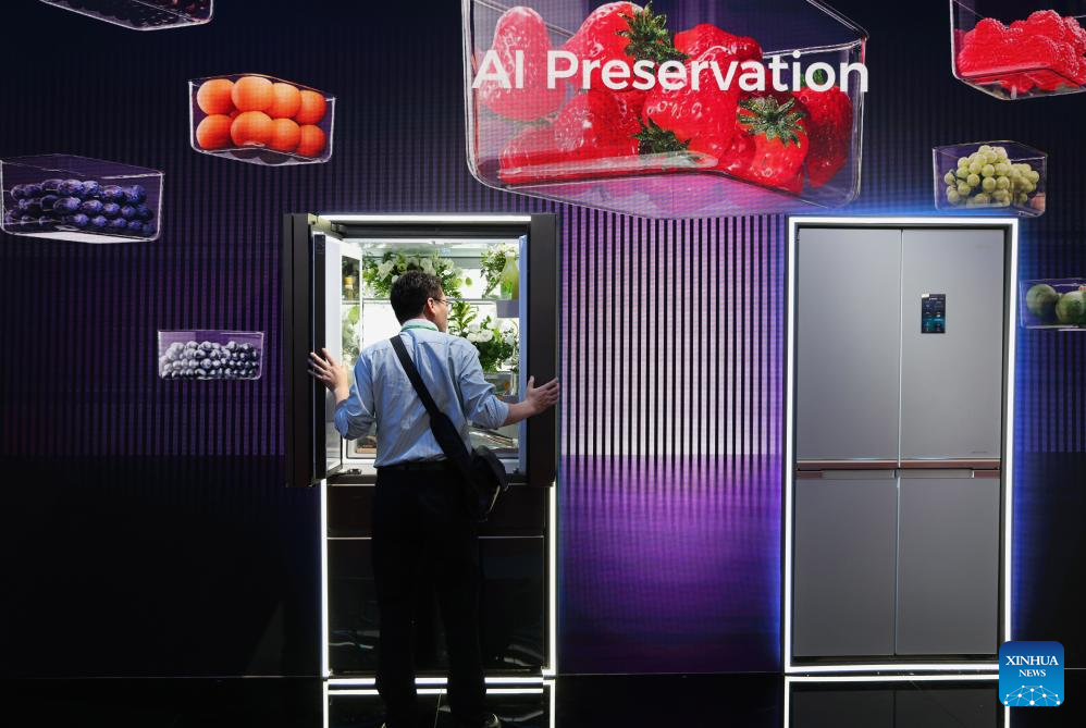 A buyer learns about an intelligent refrigerator during the 137th edition of the China Import and Export Fair in Guangzhou, south China's Guangdong Province, April 16, 2025. The 137th edition of the China Import and Export Fair, also known as the Canton Fair, kicked off on Tuesday, with the number of export exhibitors exceeding 30,000 for the first time in the history of this famous event.