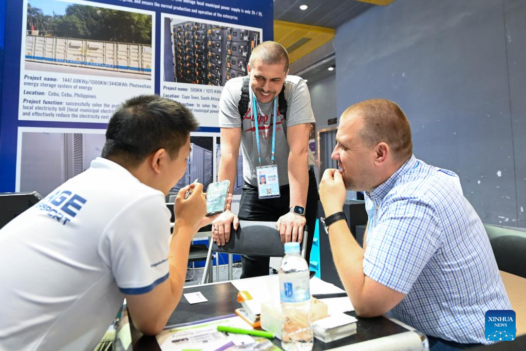 Foreign buyers learn about products at the exhibition area of new energy resources during the 137th edition of the China Import and Export Fair in Guangzhou, south China's Guangdong Province, April 16, 2025. The 137th edition of the China Import and Export Fair, also known as the Canton Fair, kicked off on Tuesday, with the number of export exhibitors exceeding 30,000 for the first time in the history of this famous event.