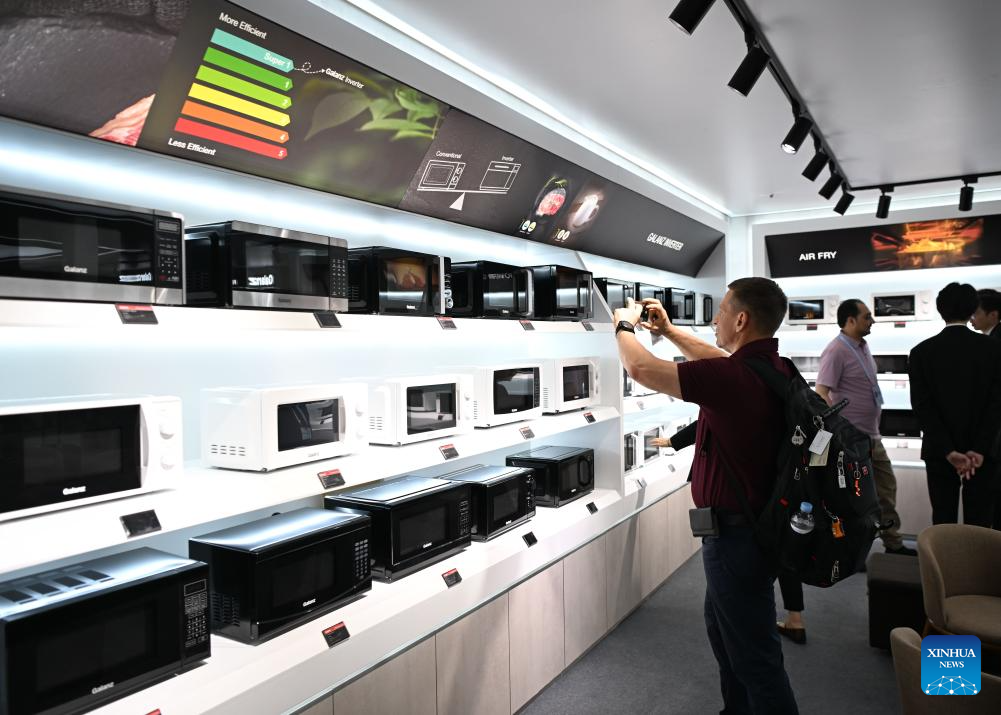 Foreign buyers inspect products of China's Galanz Group at the exhibition zone of smart life products during the 137th edition of the China Import and Export Fair in Guangzhou, south China's Guangdong Province, April 15, 2025. The 137th edition of the China Import and Export Fair, also known as the Canton Fair, kicked off on Tuesday, with the number of export exhibitors exceeding 30,000 for the first time in the history of this famous event.