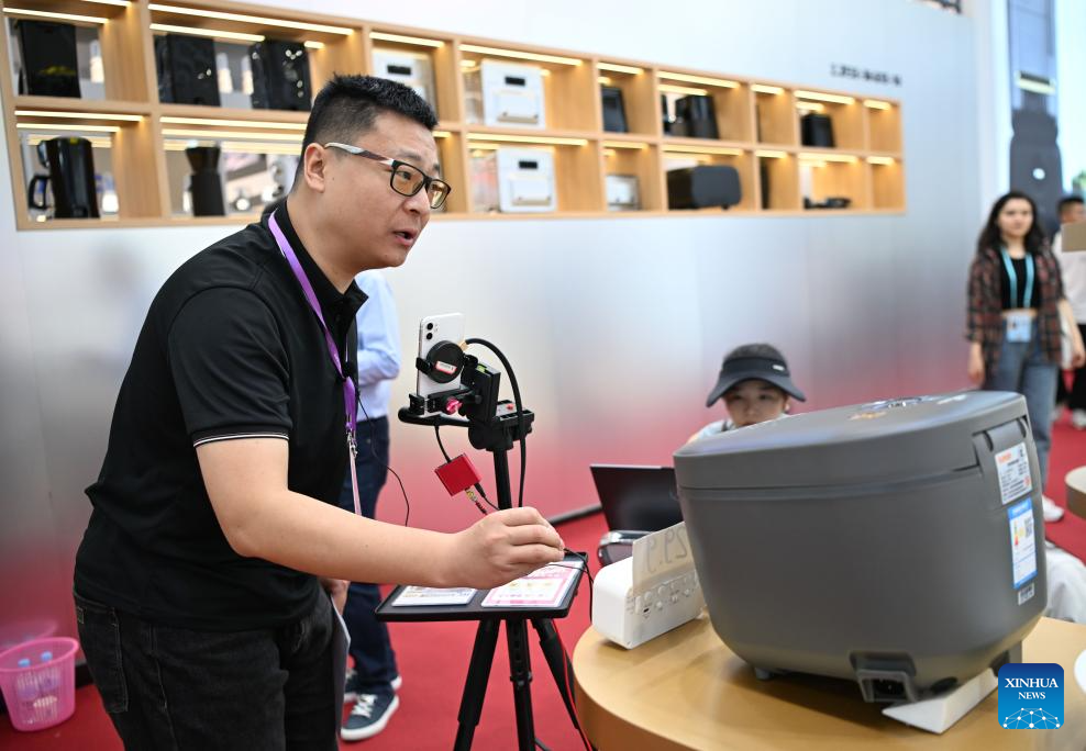 Staff member of cookware company Supor promotes rice cooker via livestream during the 137th edition of the China Import and Export Fair in Guangzhou, south China's Guangdong Province, April 16, 2025. The 137th edition of the China Import and Export Fair, also known as the Canton Fair, kicked off on Tuesday, with the number of export exhibitors exceeding 30,000 for the first time in the history of this famous event.
