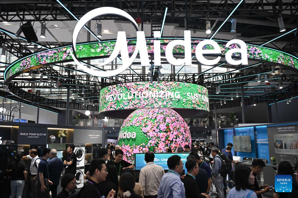 The booth of China's Midea Group is pictured at the exhibition zone of smart life products during the 137th edition of the China Import and Export Fair in Guangzhou, south China's Guangdong Province, April 15, 2025. The 137th edition of the China Import and Export Fair, also known as the Canton Fair, kicked off on Tuesday, with the number of export exhibitors exceeding 30,000 for the first time in the history of this famous event.