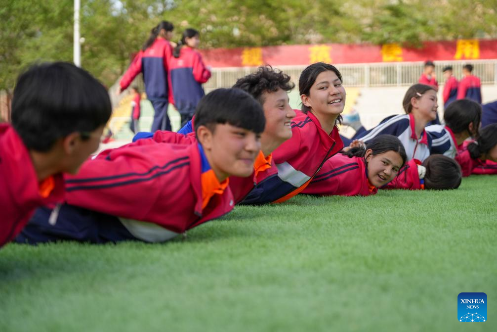 Girls of the U13 football team of Artux City show their lunch at school in Artux City, Kizilsu Kirgiz Autonomous Prefecture in northwest China's Xinjiang Uygur Autonomous Region, April 14, 2025. (Xinhua/Xu Hongyan)