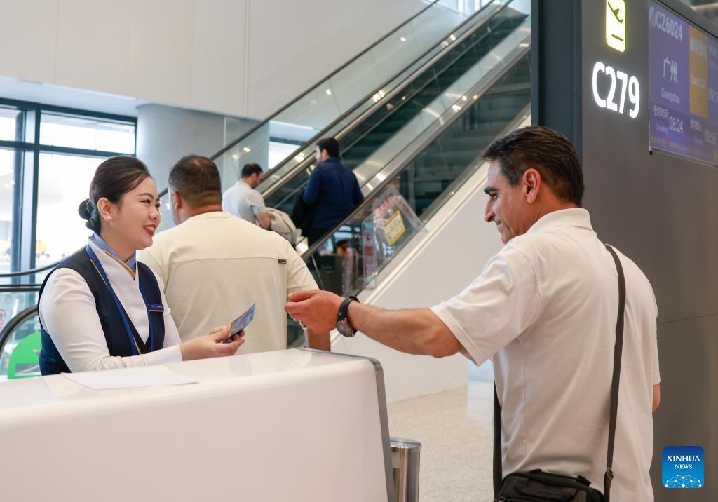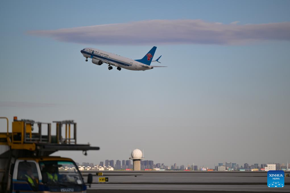 An airplane bound for Guangzhou of Guangdong Province takes off at Urumqi Tianshan International Airport in Urumqi, northwest China's Xinjiang Uygur Autonomous Region, April 17, 2025. A new terminal at Urumqi Tianshan International Airport in northwest China's Xinjiang Uygur Autonomous Region began trial operations on Thursday, marking a major step in expanding regional air capacity. (Xinhua/Xu Hongyan)
