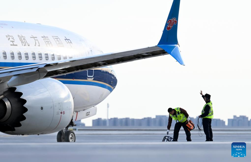 Engineers conduct inspection of an airplane at Urumqi Tianshan International Airport in Urumqi, northwest China's Xinjiang Uygur Autonomous Region, April 17, 2025. A new terminal at Urumqi Tianshan International Airport in northwest China's Xinjiang Uygur Autonomous Region began trial operations on Thursday, marking a major step in expanding regional air capacity. (Photo by Xu Rui/Xinhua)