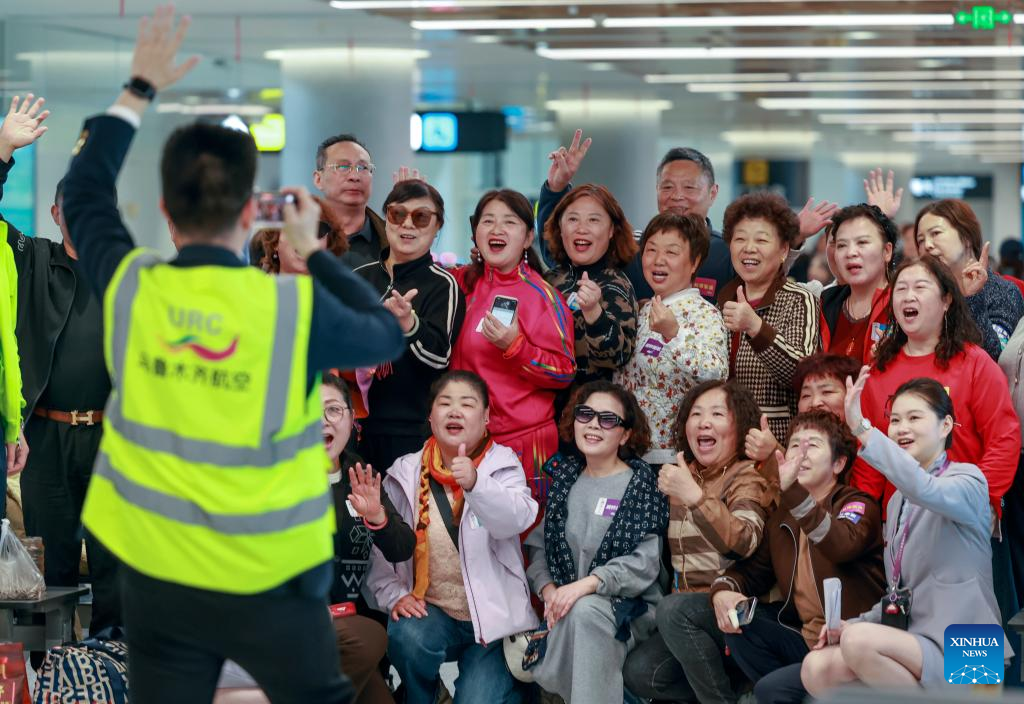 Passengers and staff members of airlines pose for photos at the waiting hall of a new terminal at Urumqi Tianshan International Airport in Urumqi, northwest China's Xinjiang Uygur Autonomous Region, April 17, 2025. A new terminal at Urumqi Tianshan International Airport in northwest China's Xinjiang Uygur Autonomous Region began trial operations on Thursday, marking a major step in expanding regional air capacity. (Xinhua/Wang Fei)
