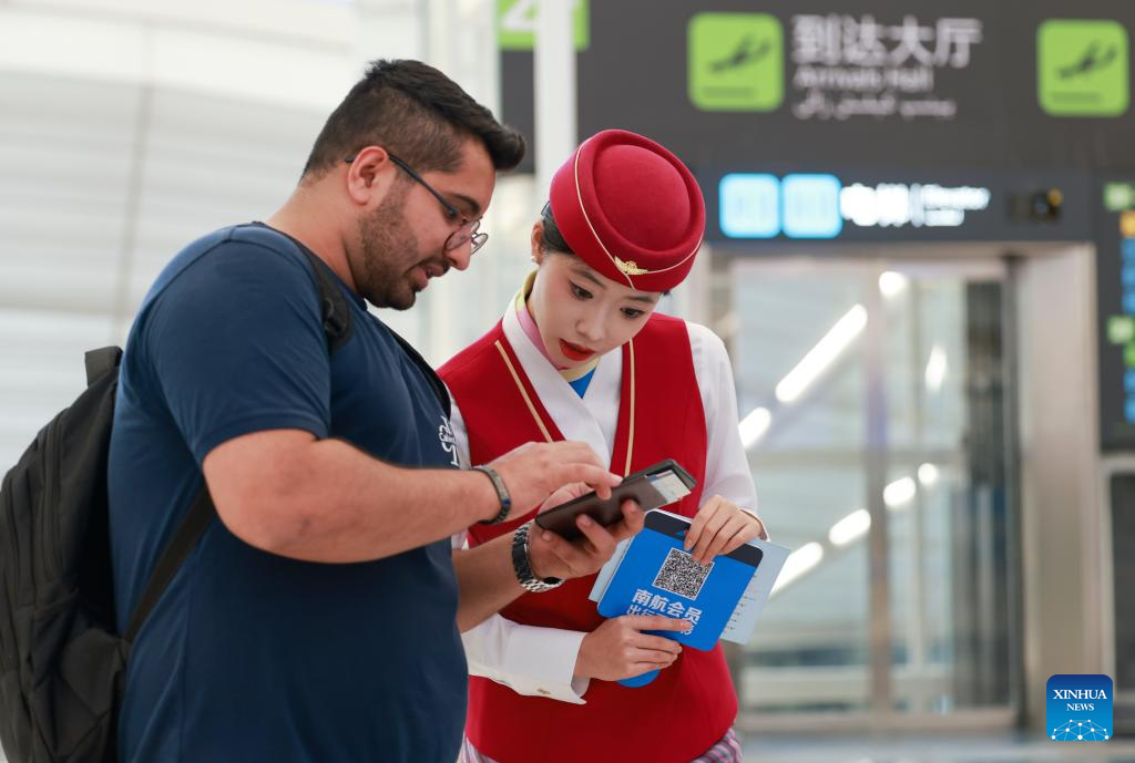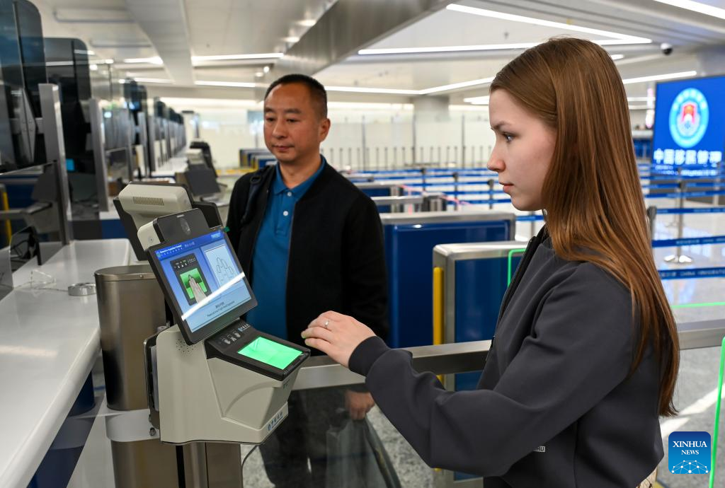 A passenger goes through entry formalities at a new terminal at Urumqi Tianshan International Airport in Urumqi, northwest China's Xinjiang Uygur Autonomous Region, April 17, 2025. A new terminal at Urumqi Tianshan International Airport in northwest China's Xinjiang Uygur Autonomous Region began trial operations on Thursday, marking a major step in expanding regional air capacity. (Photo by Xu Rui/Xinhua)