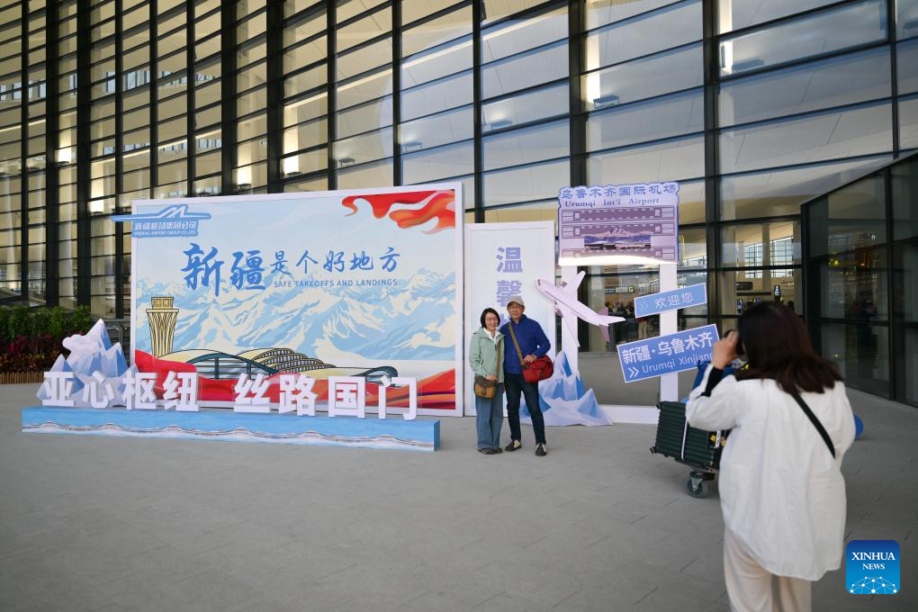 Passengers take photos outside a new terminal at Urumqi Tianshan International Airport in Urumqi, northwest China's Xinjiang Uygur Autonomous Region, April 17, 2025. A new terminal at Urumqi Tianshan International Airport in northwest China's Xinjiang Uygur Autonomous Region began trial operations on Thursday, marking a major step in expanding regional air capacity. (Xinhua/Xin Yuewei)