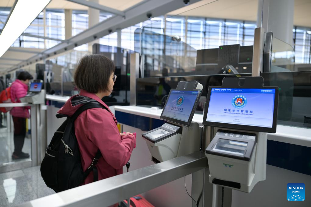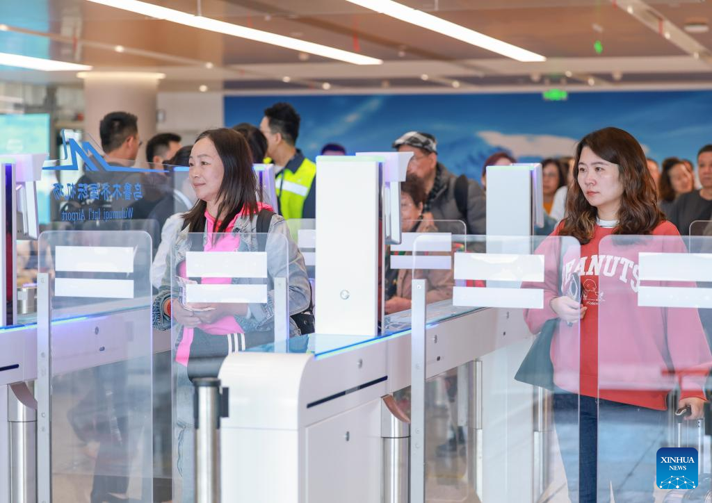 A passenger goes through exit formalities at a new terminal at Urumqi Tianshan International Airport in Urumqi, northwest China's Xinjiang Uygur Autonomous Region, April 17, 2025. A new terminal at Urumqi Tianshan International Airport in northwest China's Xinjiang Uygur Autonomous Region began trial operations on Thursday, marking a major step in expanding regional air capacity. (Xinhua/Xin Yuewei)