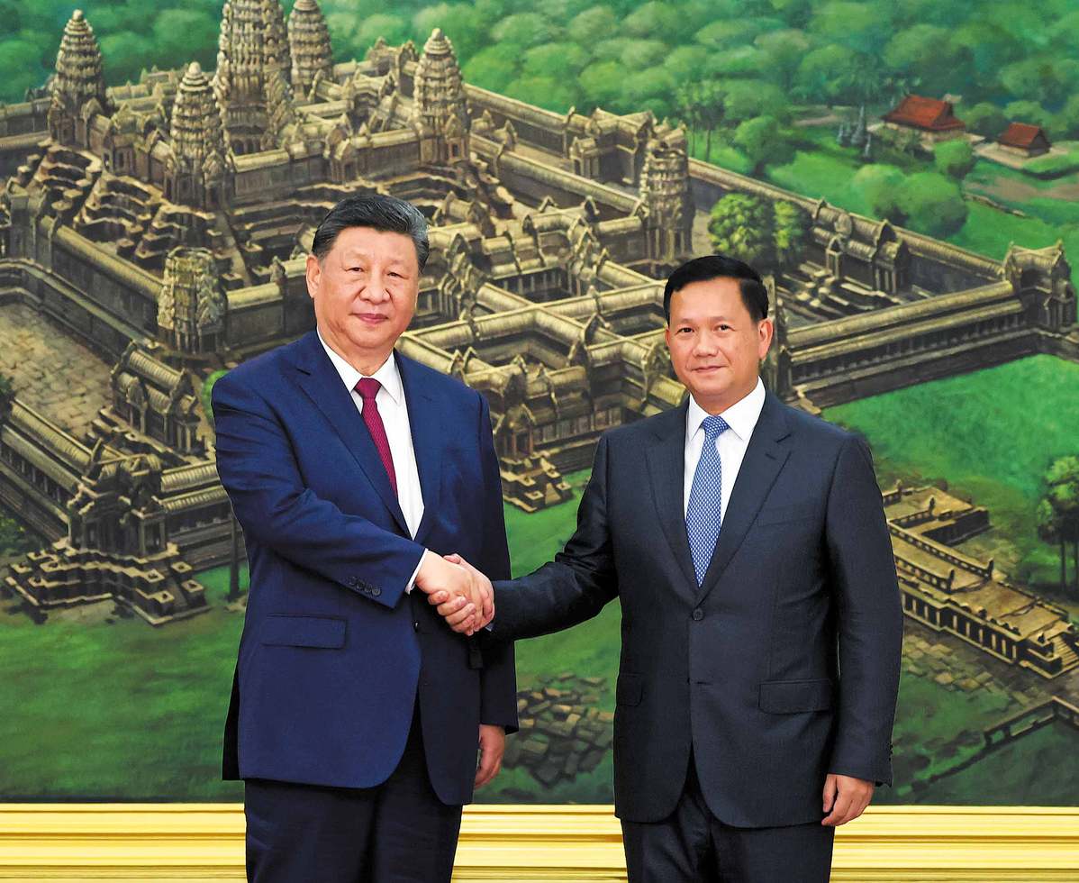 President Xi Jinping shakes hands with Cambodian Prime Minister Hun Manet during their meeting on Thursday in Phnom Penh, the capital of Cambodia. Xi arrived earlier on Thursday for a state visit to Cambodia, the last leg of the Chinese president's three-nation trip to Southeast Asia. (Photo/Xinhua)