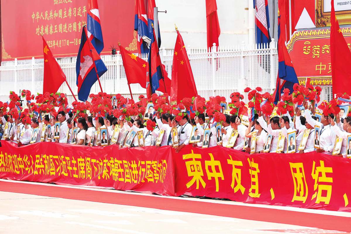 People in Phnom Penh hold flowers and wave the flags of China and Cambodia to welcome President Xi Jinping, who arrived on Thursday for a state visit to Cambodia. (Feng Yongbin/China Daily)