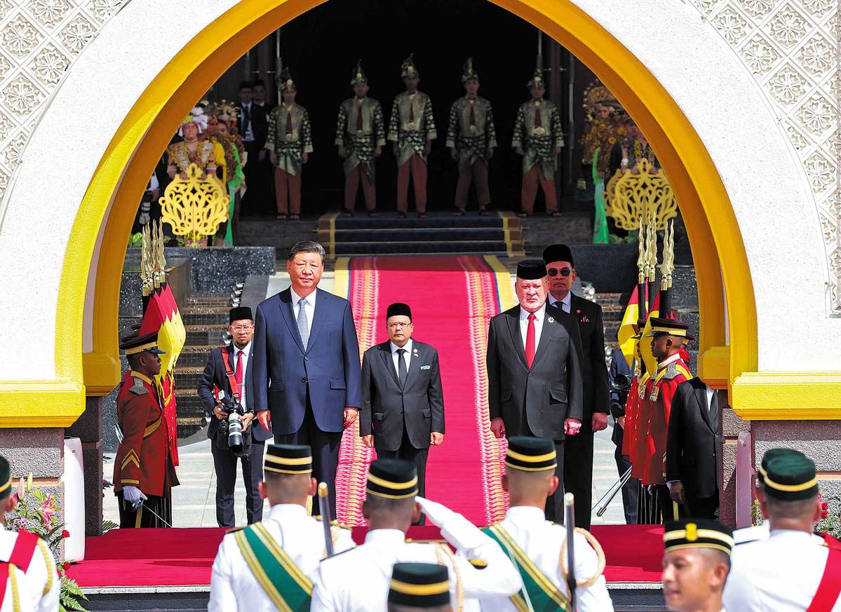 President Xi Jinping attends a grand welcoming ceremony held by Malaysian King Sultan Ibrahim Sultan Iskandar (front, right) at Istana Negara, or the National Palace, in Kuala Lumpur on Wednesday morning during Xi's state visit to Malaysia. (Photo/Xinhua)