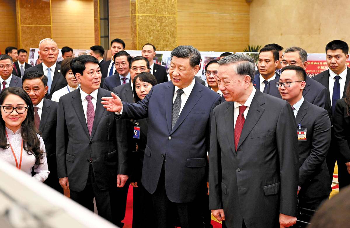 President Xi Jinping, who is also general secretary of the Communist Party of China Central Committee, To Lam (front, right), general secretary of the Communist Party of Vietnam Central Committee, and Vietnamese President Luong Cuong (front, left), visit a photo exhibition marking the 75th anniversary of the establishment of China-Vietnam diplomatic ties in Hanoi on Tuesday. (Photo/Xinhua)