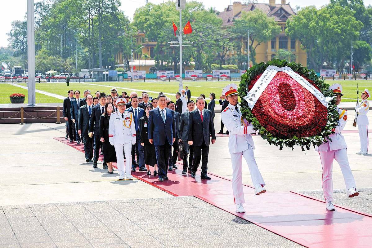 General Secretary of the CPC Central Committee and Chinese President Xi Jinping, accompanied by General Secretary of the CPV Central Committee To Lam, visits Ho Chi Minh Mausoleum in Hanoi on Tuesday morning to pay tribute to the late Vietnamese leader. (Photo/Xinhua)