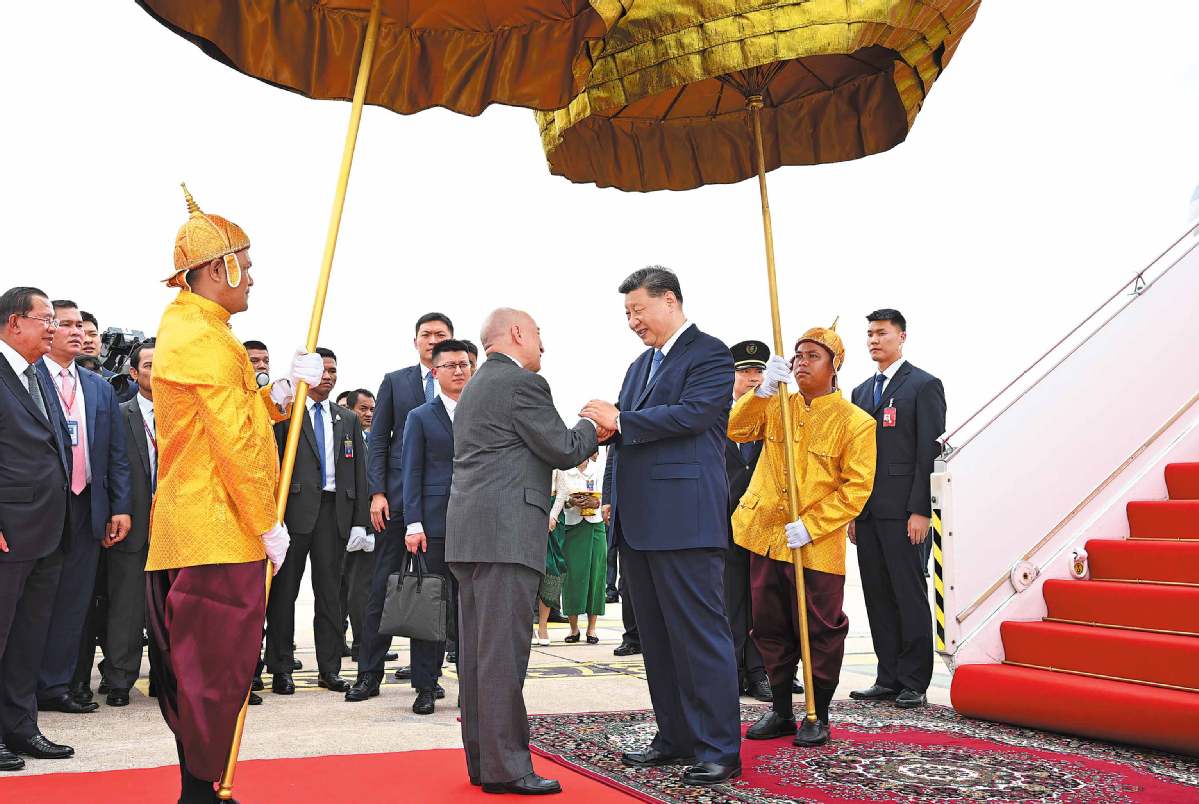 President Xi Jinping is greeted on Thursday by Cambodian King Norodom Sihamoni during a grand welcoming ceremony upon Xi's arrival in Phnom Penh. (Photo/Xinhua)