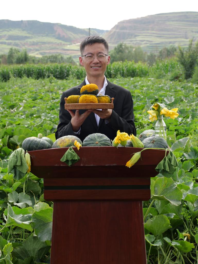 This photo taken in August 2024 shows Ma Liang promoting pumpkins from his hometown at a farmland in Xiji County, northwest China's Ningxia Hui Autonomous Region. (Xinhua)