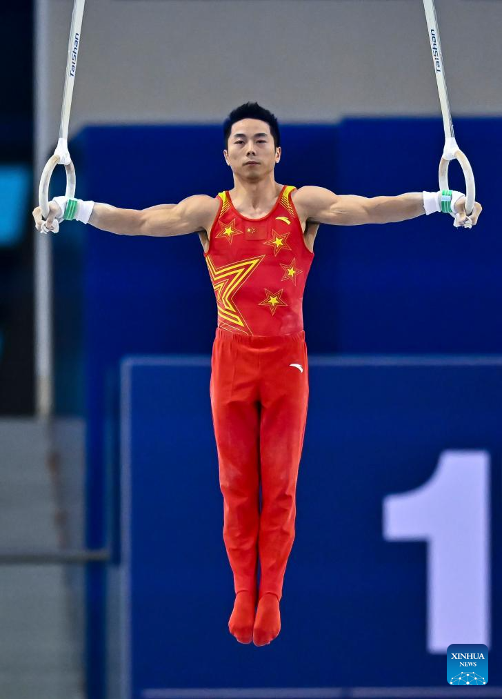 You Hao of China competes during the men's Still Rings qualifying round of the 17th FIG Artistic Gymnastics Apparatus World Cup in Doha, Qatar, April 16, 2025. (Photo by Nikku/Xinhua)