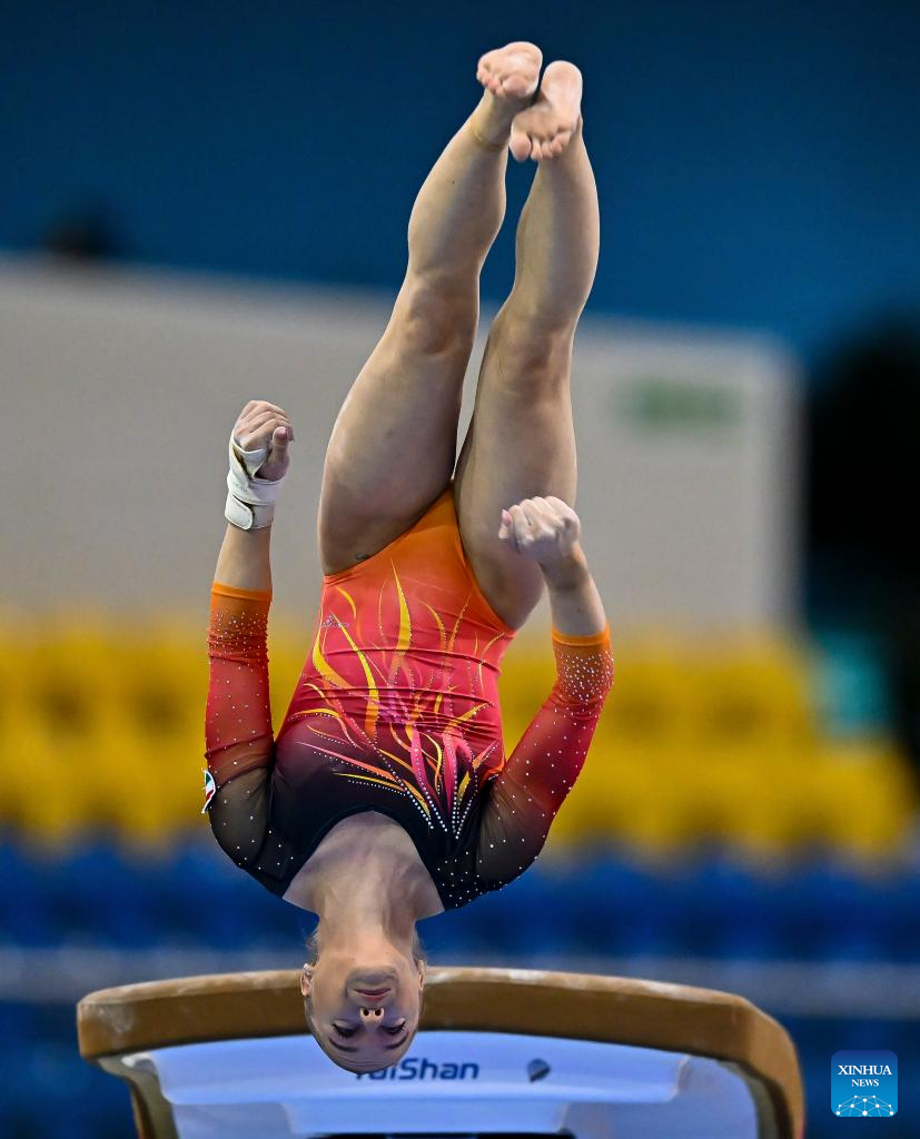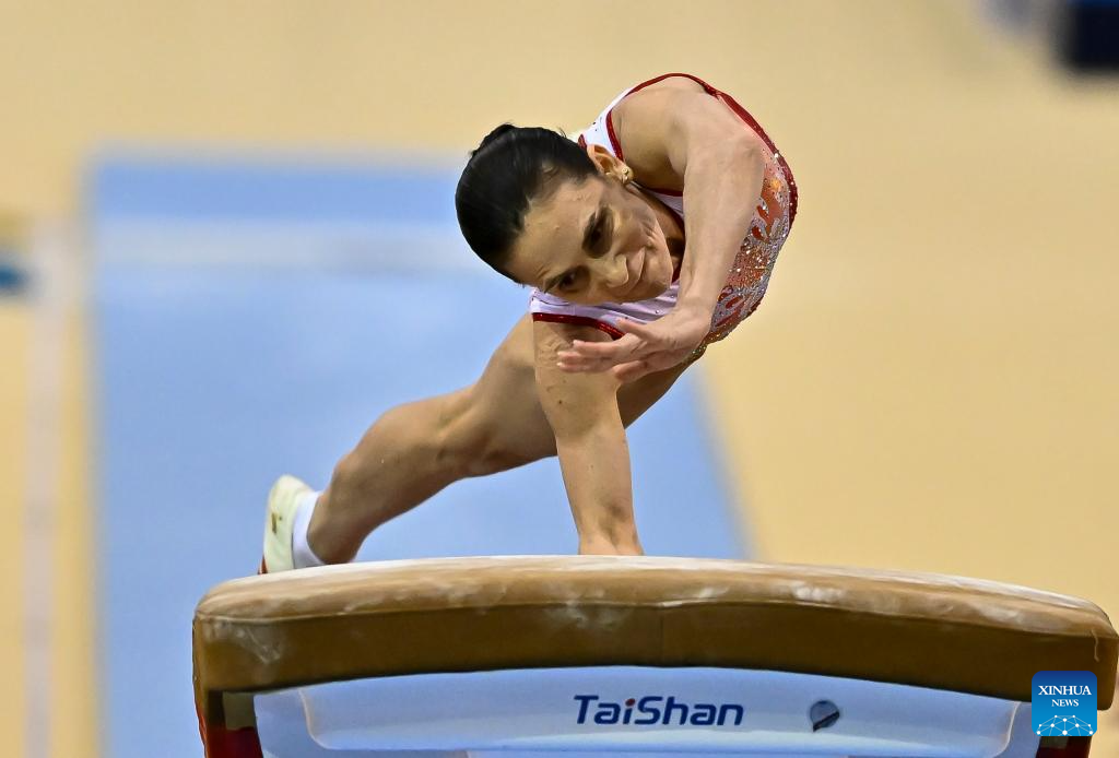 Greta Mayer of Hungary competes during the women's Vault qualifying round of the 17th FIG Artistic Gymnastics Apparatus World Cup in Doha, Qatar, April 16, 2025. (Photo by Nikku/Xinhua)