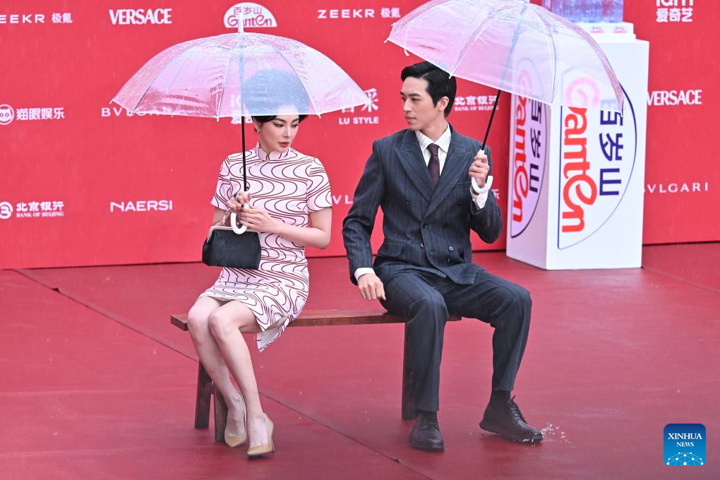 Actress Zhang Yuqi and actor Xu Weizhou are pictured on the red carpet of the 15th Beijing International Film Festival (BJIFF) in Beijing, capital of China, April 18, 2025. The 15th BJIFF kicked off on Friday in the Chinese capital. (Xinhua/Li Xin)