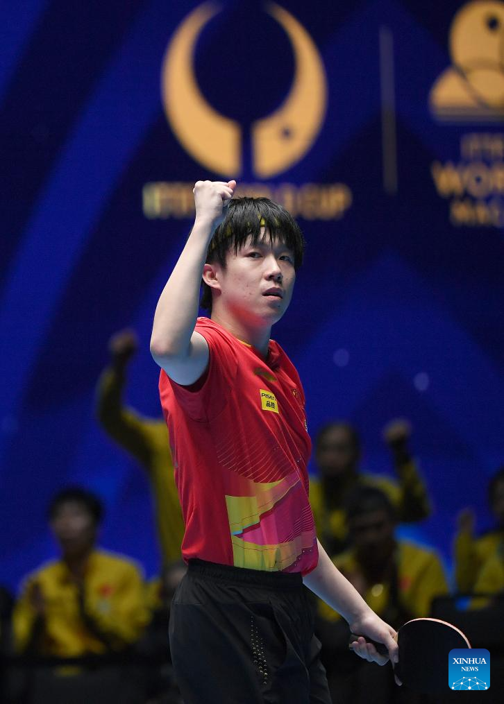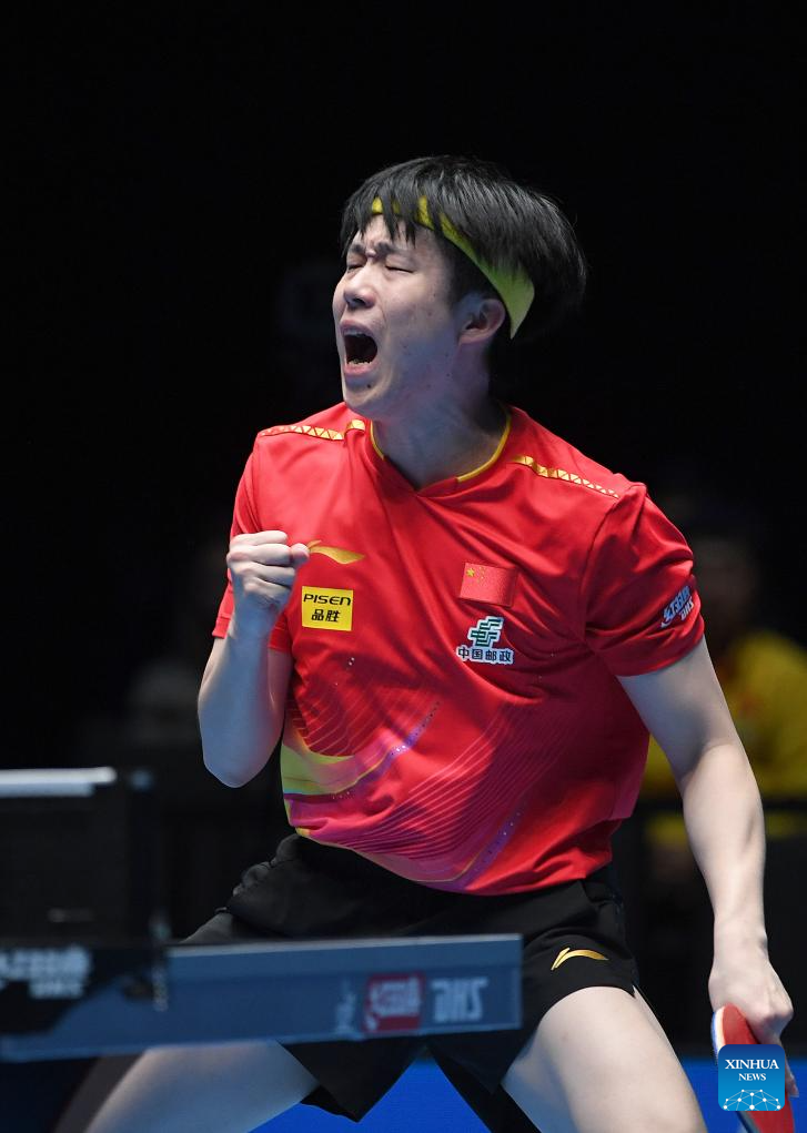 Wang Chuqin celebrates scoring during the men's singles semifinal between Wang Chuqin of China and Hugo Calderano of Brazil at the ITTF Men's and Women's World Cup 2025 in Macao, China, April 19, 2025. (Xinhua/Chen Duo)