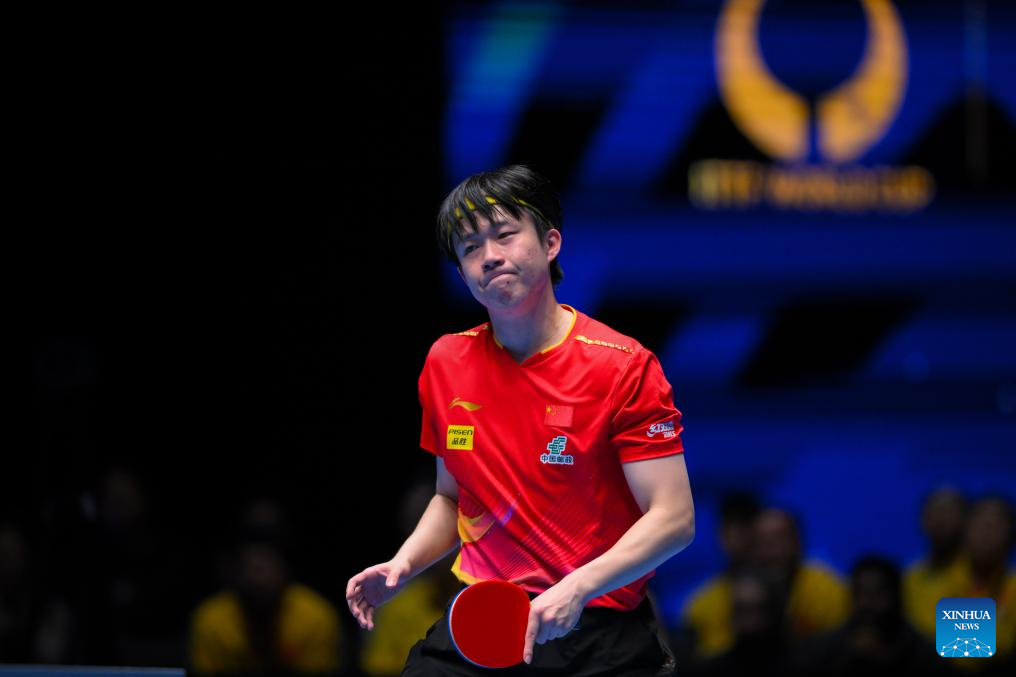 Wang Chuqin reacts during the men's singles semifinal between Wang Chuqin of China and Hugo Calderano of Brazil at the ITTF Men's and Women's World Cup 2025 in Macao, China, April 19, 2025. (Xinhua/Cheong Kam Ka)