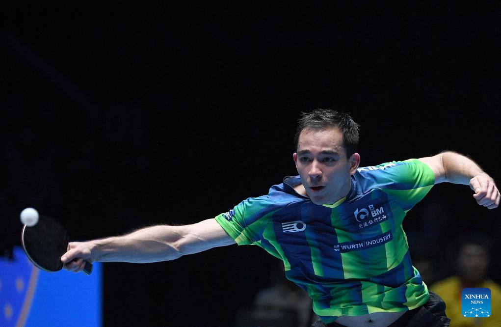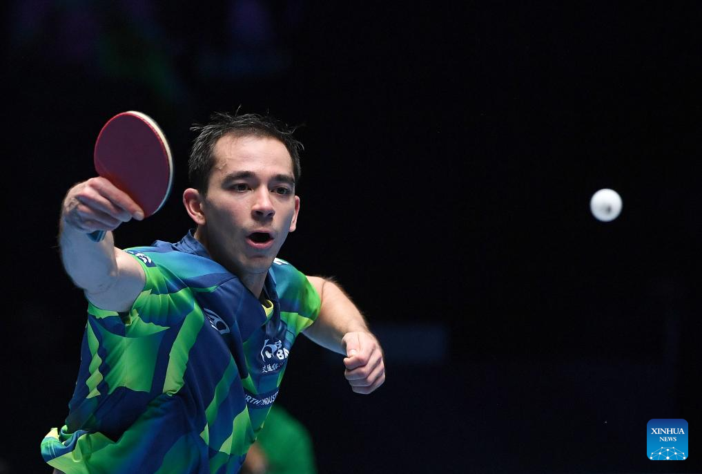 Hugo Calderano hits a return during the men's singles semifinal between Wang Chuqin of China and Hugo Calderano of Brazil at the ITTF Men's and Women's World Cup 2025 in Macao, China, April 19, 2025. (Xinhua/Chen Duo)