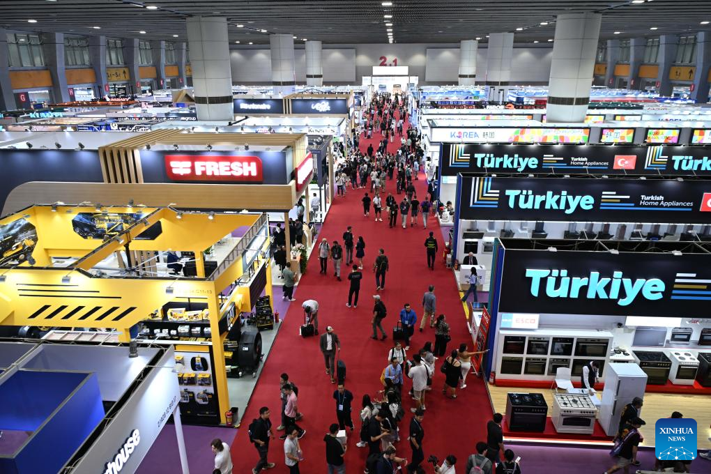 This photo taken on April 16, 2025 shows a scene at the venue of the 137th edition of the China Import and Export Fair in Guangzhou, south China's Guangdong Province. The first phase of the 137th edition of the China Import and Export Fair, also known as the Canton Fair, concluded here on Saturday. By April 19, a total of 148,585 overseas buyers from 216 countries and regions had attended the event, marking a 20.2 percent increase compared to the same period last year. (Xinhua/Deng Hua)