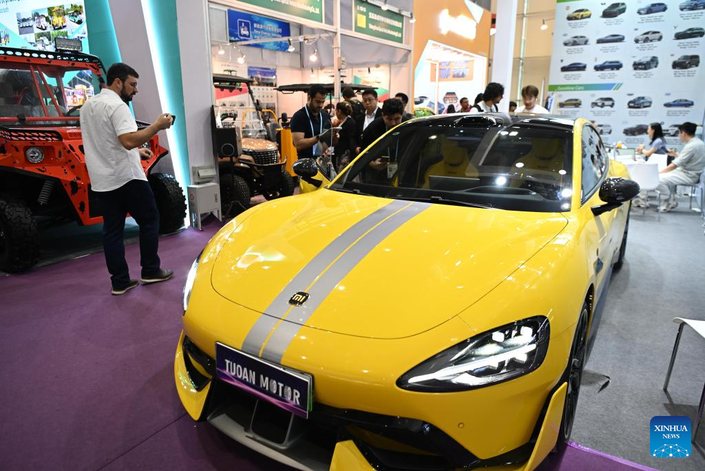 Overseas buyers view a new energy vehicle displayed during the 137th edition of the China Import and Export Fair in Guangzhou, south China's Guangdong Province, April 18, 2025. The first phase of the 137th edition of the China Import and Export Fair, also known as the Canton Fair, concluded here on Saturday. By April 19, a total of 148,585 overseas buyers from 216 countries and regions had attended the event, marking a 20.2 percent increase compared to the same period last year. (Xinhua/Deng Hua)